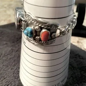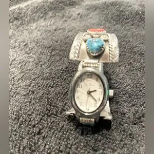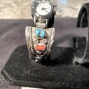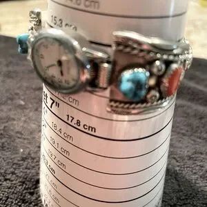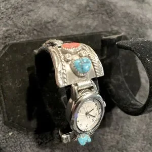 Elegant featuring turquoise and coral stones with new watch installed 6/27/25 by Govind & Sons Jewelers. Watchband is engraved by initials J.B.P inside band. Measures 6 “ when extended on band measurement cone. Band was purchased by my 105 yr old Mother in mid 1970’s. Perfect for adding a touch of color to your outfit.