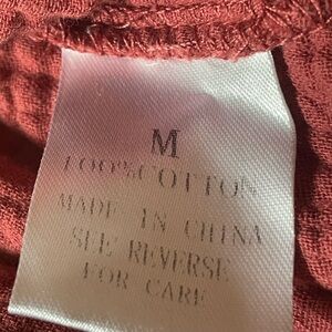 This sleeveless dress features a stylish button-front design, perfect for casual outings. The rich cinnamon red/brown color adds fun to your summer. Elastic waist with self tie for perfect fit. Hem and edges of pockets have a frayed look (on purpose!). Lightweight waffle look fabric