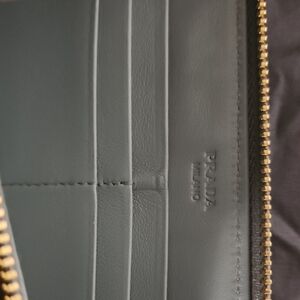 Chic Prada wallet in sky blue leather. Features zip closure and signature logo.