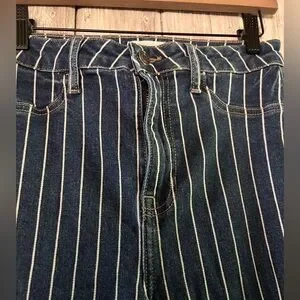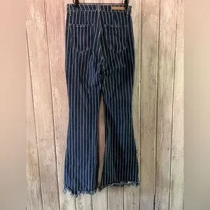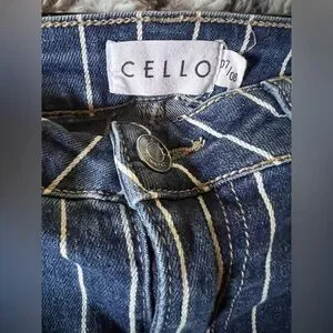 Embrace a retro-inspired look with these Cello flare jeans, featuring a striking blue and white pinstripe design. Faux Front pockets The high-waisted style and wide-leg silhouette offer a flattering fit, while the subtle frayed hem adds a touch of vintage charm. Perfect for making a statement with a nod to 1970s fashion.