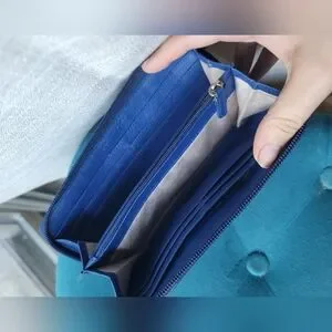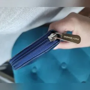 This stylish Michael Kors wallet features a striking blue design, exuding elegance and sophistication. The gold-toned brand label adds a touch of luxury, making it a perfect accessory for any occasion. Its compact size ensures convenience while maintaining a chic appearance.