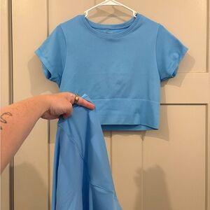 Stylish blue matching set featuring a top and cross leggings - both from Aerie. Perfect for working out or running errands.