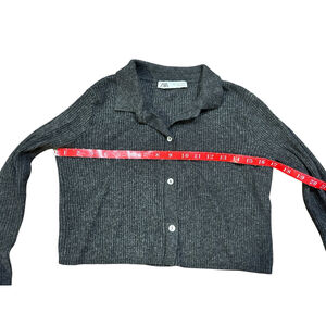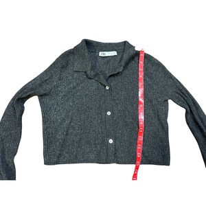 This is a pre-owned Zara cropped cardigan in a dark gray ribbed knit. It features a collared neckline and a button-down front with four abalone style buttons. The cardigan has long sleeves and a straight hem. Good used condition. The size is S.