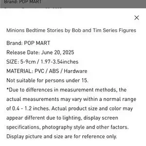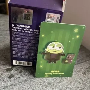 This Pop Mart box is from the Minions Bedtime Stories by Bob and Tim Series Figures set. Bob Minion action figure, with his classic heterchromia eyes, and his charming Tim teddy bear companion. Perfect for fans of Minions and Halloween. The box has been opened but all pieces of the figurine are in their sealed packaging still! This is great for someone who doesn’t want to continue to buy multiple boxes just to get ahold of this Frankenstein-inspired, Spooky Wives Tales Minions figurine! So adorable - this series has Bob and Tim reading themed books and this one is Halloweeny!