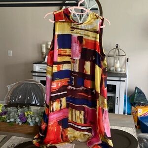 This striking sundress by Signature features a sleeveless design with a cowl neck, perfect for casual or cocktail occasions. The dress showcases a bold red and blue geometric pattern, adding a touch of modern artistry to your wardrobe. Its midi length and lightweight fabric ensure comfort and style throughout the day. Tie in back at neck.