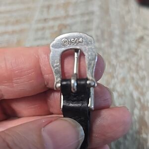 The Vintage 1994 Brighton Roped Heart Braid Bandit Brown Silver Buckle Bracelet is a stylish and unique accessory that features a heart-shaped design in a brown color. The bracelet is adorned with a silver buckle closure, giving it a secure yet fashionable look. Measuring 11 inches in length, this wrap bracelet is made of rope chain, adding a touch of texture to the piece. Perfect for adding a touch of vintage flair to any outfit, this bracelet is a timeless treasure for any jewelry collection.