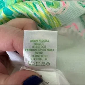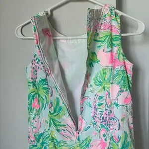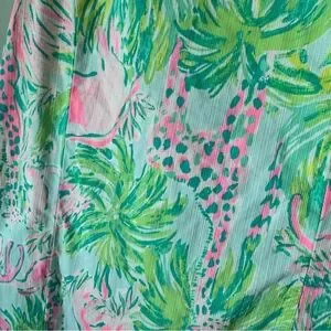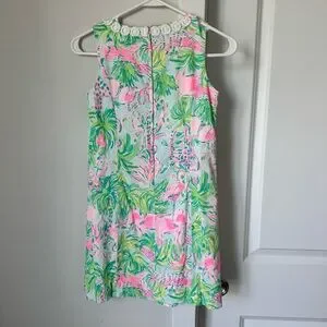 Lilly Pulitzer Mini Mila Shift Dress in pattern Seasalt Blue on Parade, girls’ size 12. Dress features a bright pink and green pattern of jungle animals and palm trees, white lace appliqué around the collar, white lining, and a zipper up the back. 100% cotton shell. Dress is in excellent pre-owned condition.