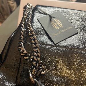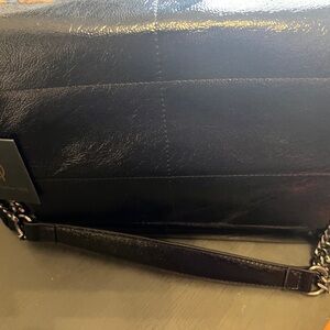 This elegant black leather handbag features a sleek design with a stylish chain strap. Perfect for any occasion, it combines functionality with a touch of luxury.
