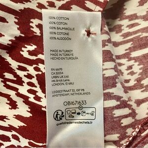The Anthropologie Maeve bohemian dress showcases a sophisticated burgundy, and white design, perfect for casual or work settings. Featuring a notched collar and 3/4 bishop sleeves, it offers a stylish and comfortable fit. The dress's A-line silhouette and intricate pattern add a touch of elegance, making it a versatile addition to any wardrobe.