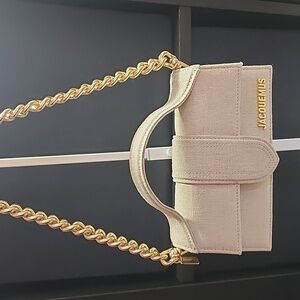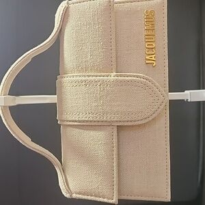 Elegant Jacquemus handbag in taupe. Features a sleek handle and gold logo accent.
