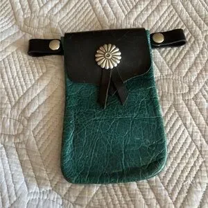 Handmade leather pouch to strap to side bags of a motor cycle or belt loops. Great for the larger phones or for smokes. Inner pocket as well. 7” tall and 4.6” wide for pouch itself.