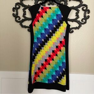 Maggie London (Maggie L) sleeveless sheath style dress with and eye catching geometric pattern and flattering black side panels.