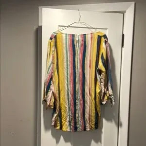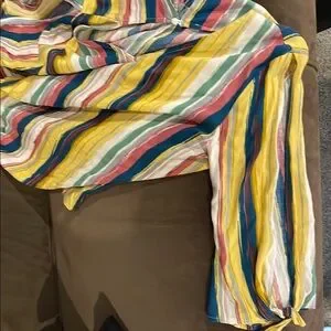 Staccato blouse featuring a vibrant mix of yellow and blue stripes and unique sleeves with openings down the arm and knotted at the end. The 3/4 sleeves and boxy silhouette offer a comfortable fit, perfect for casual outings. Crafted from a lightweight fabric, this top ensures a breezy feel throughout the day and summer evenings.