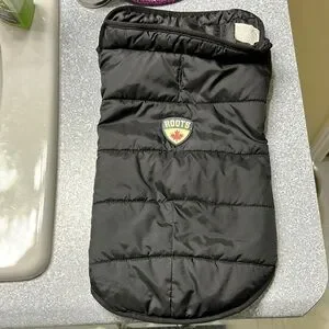 This stylish black dog vest from Roots is designed to keep your pet warm and cozy with its quilted, water-resistant fabric. The practical design ensures comfort during chilly walks, while the sleek look adds a touch of elegance to your dog's wardrobe.