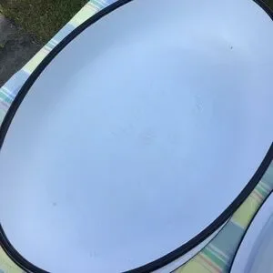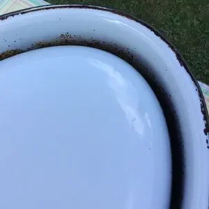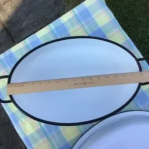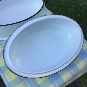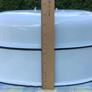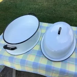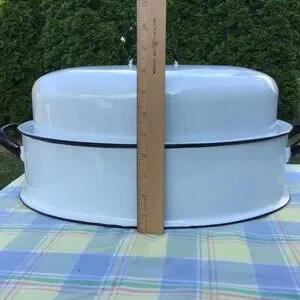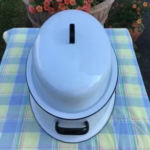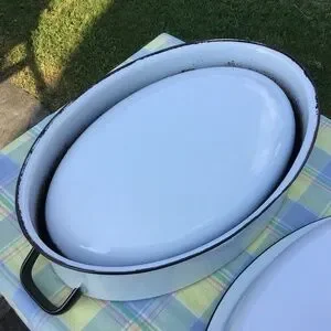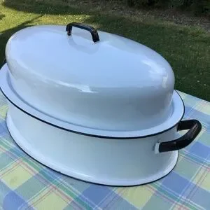 Vintage Enamel Roasting Pan & Lid Large Oval White Black Roaster EUC