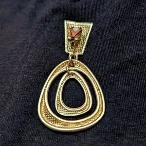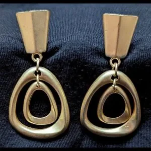 Clip-on dangle earrings. Matte gold in color. Dangle is two pieces, connected with a loop, and measures 1.25" from top to bottom. Full earring measures about 2.25" from top to bottom. Nice earrings for those without pierced ears!