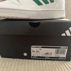 Classic Adidas Break Start shoes. Crisp white with bold green stripes. Ideal for everyday style.