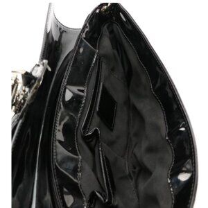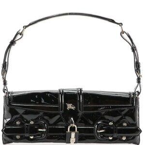 Burberry black patent leather shoulder bag, often referred to as a "pochette" or "hobo bag", featuring buckle and stud details, and a functional padlock with a key. It is made in Italy and includes the signature Burberry Equestrian Knight logo detail on the flap.