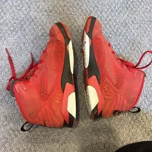 These vibrant red and black sneakers feature a high-top design with a breathable mesh upper and synthetic materials for durability. The visible lacing system ensures a secure fit, while the dark-colored soles provide excellent contrast and traction. Perfect for athletic activities or casual wear, these sneakers offer both style and functionality.
