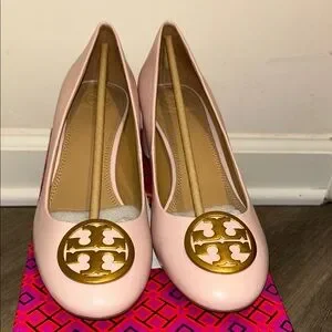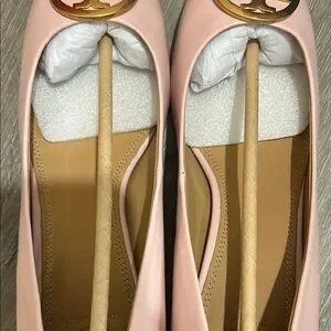 These Tory Burch flats showcase a sophisticated blend of pink and gold, highlighted by the signature double-T logo medallion. Crafted with a rounded toe and a subtle heel, they offer both comfort and elegance. The gold accents beautifully complement the soft pink leather finish, making them a timeless addition to any wardrobe. Seashell pink new in box