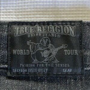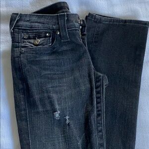 True Religion black jeans size 25 straight legs, rhinestones buttons details. Shirt zipper. Distressed. Gently used condition. 99% cotton and 1% elastine