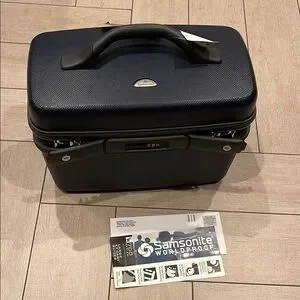 Elegant Samsonite carry-on in midnight blue. Compact and sturdy for travel.