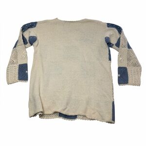Vintage Newport News Easy Style crochet knit sweater in a blue and cream patchwork pattern. Features mixed crochet textures with pearl floral appliqué accents throughout. Cozy, substantial knit with a relaxed silhouette — perfect paired with denim or layered for cooler weather.