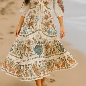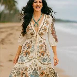 This incredibly beautiful bohemian dress is a true work of art, radiating elegance and free-spirited charm. It features a maxi length silhouette that flows gracefully to the ankles, creating a soft, romantic movement with every step. The dress is crafted from a lightweight, ivory-hued fabric adorned with ornate, multicolor floral and botanical embroidery in earthy tones-burnt orange, soft lavender, dusty blue, olive, and golden yellow.