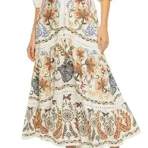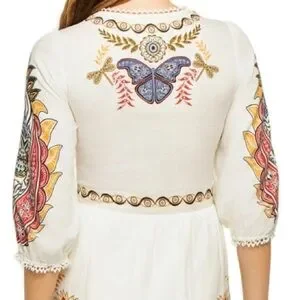 The sleeves are three-quarter length with a slightly puffed shape, ending in subtle scalloped lace trim at the cuffs. The skirt is beautifully tiered, with each section showcasing a different embroidered motif-from butterflies to florals to intricate paisley and leaf patterns, giving the piece a globally inspired aesthetic.