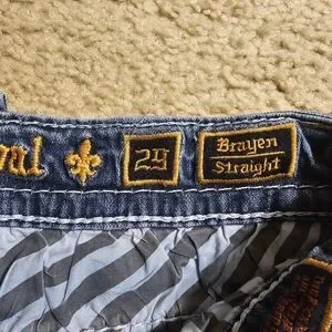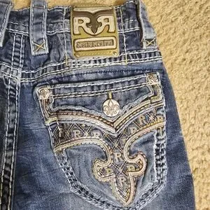 Stylish Rock Revival jeans in blue. Features intricate embroidery on back pockets. Silver and gold accents add flair. The inseam is 30 .