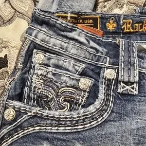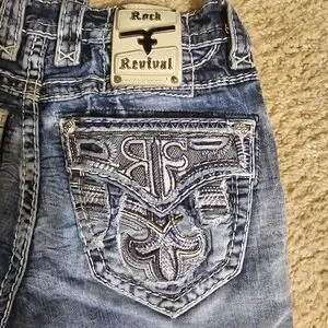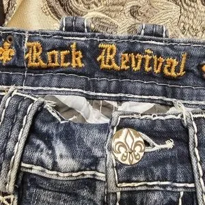 Discover the signature style of Rock Revival with these blue jeans, showcasing exquisite embroidery and a distressed look. The intricate detailing on the back adds a unique flair, making these jeans a must-have for any fashion-forward wardrobe. Perfect for those who love a blend of classic denim with contemporary embellishments.