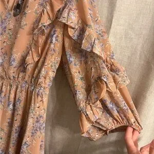 Embrace elegance with this floral ruffle dress. Featuring a beautiful tan base with delicate purple floral patterns, this dress is perfect for any occasion. The ruffle details add a touch of femininity and charm.