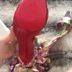 Christian Louboutin Floral satin ribbon weave red bottoms multicolor floral fastening ankle strap, can remove ribbon and wear without as well. Open toe.