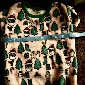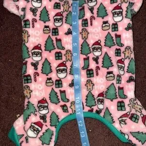 These cozy doggy pajamas feature a festive Santa and tree pattern on a soft pink background. Perfect for holiday nights, these pajamas offer comfort and style. Ideal for keeping your little one warm and cheerful. Size Medium. See measurements on pics. New-never worn. 100% polyester