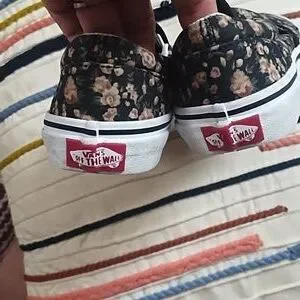 Vans slip-ons with a floral design. Black base with pink and cream flowers.
