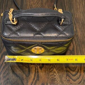 Tory Burch Willa Mini Vanity Bag Quilted Crossbody Shoulder Black Leather NWT. No spots or marks. Smoke free household. Pics show measurements. Pics taken with and without flash to show color appearance variation. Brand new.Can be worn as shoulder bag or cross body although please check strap length for crossbody wear as it is not adjustable. Some with dust bag.