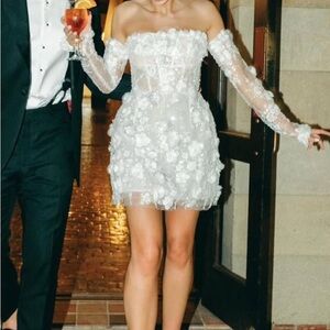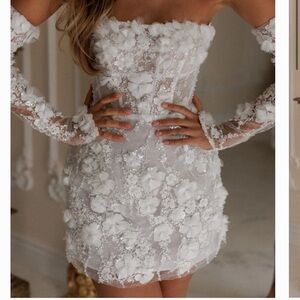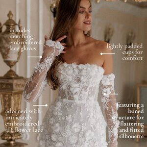 Isabelle is the epitome of timeless elegance. Crafted from exquisite European lace, adorned with intricately embroidered 3D flower lace that glistens with delicate beading. This A-line, mini dress is designed with precision, featuring a boned structure for a flattering and fitted silhouette. As part of our limited edition couture line, Isabelle offers brides a one-of-a-kind gown to define their special day.