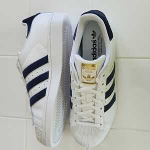 Classic Adidas sneakers with a white base and dark blue stripes. Comfortable and stylish for everyday wear. Brand new in box