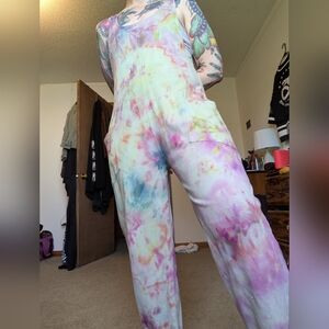 This For Days jumpsuit is made of buttery soft organic cotton. It is extremely versatile and can be dressed up from totally casual lounge wear to something more refined. Straight legged, a pocket on each side. The base is a light sage while the rest of the garment has been ice dyed by hand with lovely tones of fuschia, purple, and red.