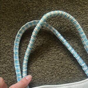 Charming tote bag featuring a Peter Rabbit design on front a back. Blue and white gingham interior Perfect for casual use, children’s tote, or an Easter bag. The white and blue colors beautiful artistry, and real cotton ball detail make this bag special. May show subtle signs of use – particularly on the handles.