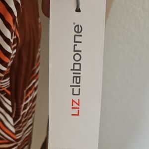 Liz Claiborne's vibrant tropical print midi skirt with an elastic waistband. Perfect for any occasion, this skirt features a stunning blend of orange, tan, and white hues. Pair it with your favorite top for a chic look.