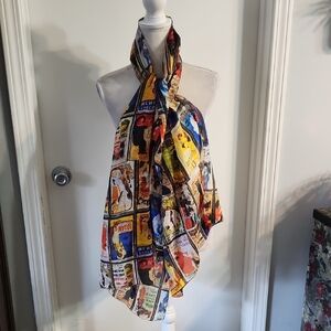 Vibrant scarf with a graphic print. Features a mix of colors including red, blue, yellow, and black. Perfect for adding a pop of color to any outfit.