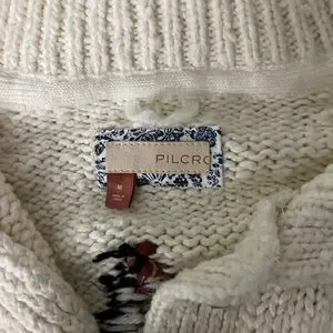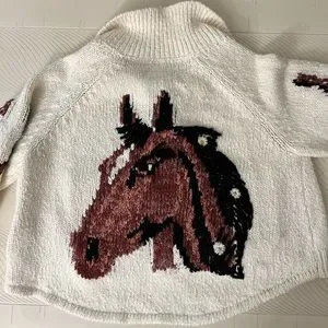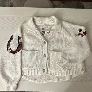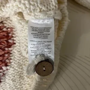Cozy cream cardigan. Features red and black accents. Button-up front. Two front pockets. Perfect for layering.