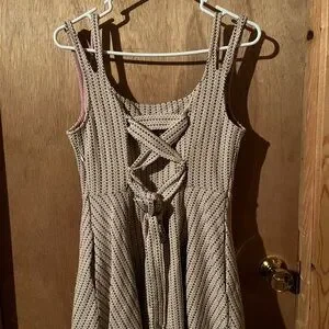 Chic Maeve midi dress with a textured beige pattern. Features a soft pink lining. Perfect for stylish outings.