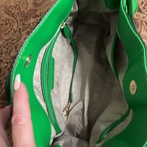 The Michael Kors Green Satchel is a sophisticated accessory that combines elegance with functionality. Crafted in a vibrant green hue, this satchel features structured styling and gold-tone hardware, including a prominent front lock closure. Its medium size and double top handles make it perfect for everyday use, while the classic silhouette adds a touch of timeless charm.