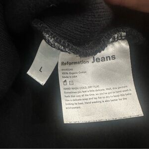 The Reformation Sweater is a stylish and sustainable option for women, made from 100% organic cotton in a classic black color with a ribbed design. This oversized cropped sweater features a relaxed fit and a scoop neckline, perfect for a casual and comfortable look. The hand wash only care instruction ensures that this knit sweater stays in top condition for a long time, making it a versatile and chic addition to any wardrobe.
