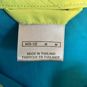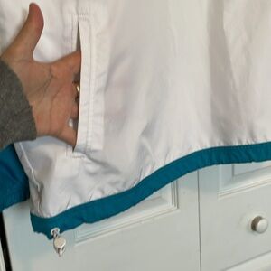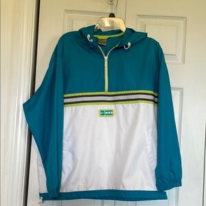 Stylish and comfortable, this VTG Nike windbreaker jacket features a vibrant teal lime green & white design. Quarter zip hooded drawstring on hood and waist. Elastic cuffs 23.5” pit to put 26.5” shoulder to hem. Just as cute from the back!!