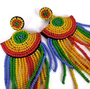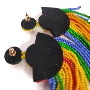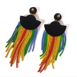 Brand new, never worn beaded stud dangle earrings. Flowing rainbow strands. Black felt backing. Approximate measurements: 4.25" length, .5" width.