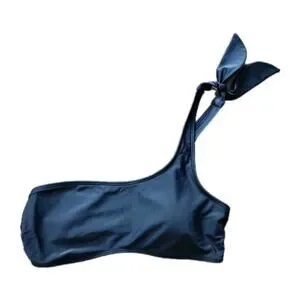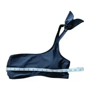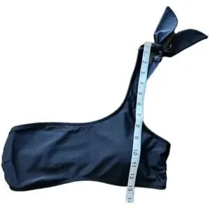 The product is a stylish black one-shoulder tie bikini top by Abercrombie & Fitch in size M. Made from nylon and spandex, this top features a wide strap, adjustable strap, and slightly padded cups for a comfortable fit. The one-piece swimsuit top is designed with a tie accent and is perfect for beach days or lounging by the pool. Made in Vietnam, this top is recommended for hand wash only to maintain its quality.