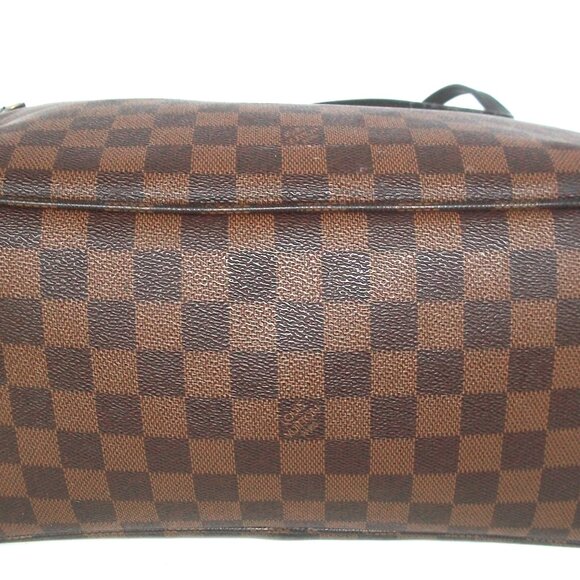 A large shoulder tote in the style of the Damier Ebene Neverfull GM.=.With red cotton interior with large stand-alone zippered pocket, hook-in-link -top closure and little attached key ring inside.